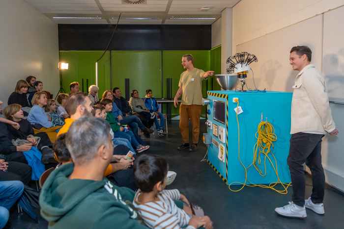 Tijdens de dag kregen ze intrigerende vragen voorgeschoteld die laten zien waar wetenschappers zich mee bezighouden. Zoals: Hoe maak je een wc schoon met poep? Hoe ontstaat een tornado? Hoe lijm je een bril op een sprinkhaan? Hoe weet AI wat een kromme banaan is? En: ben jij een pragmatische of een rationele denker?